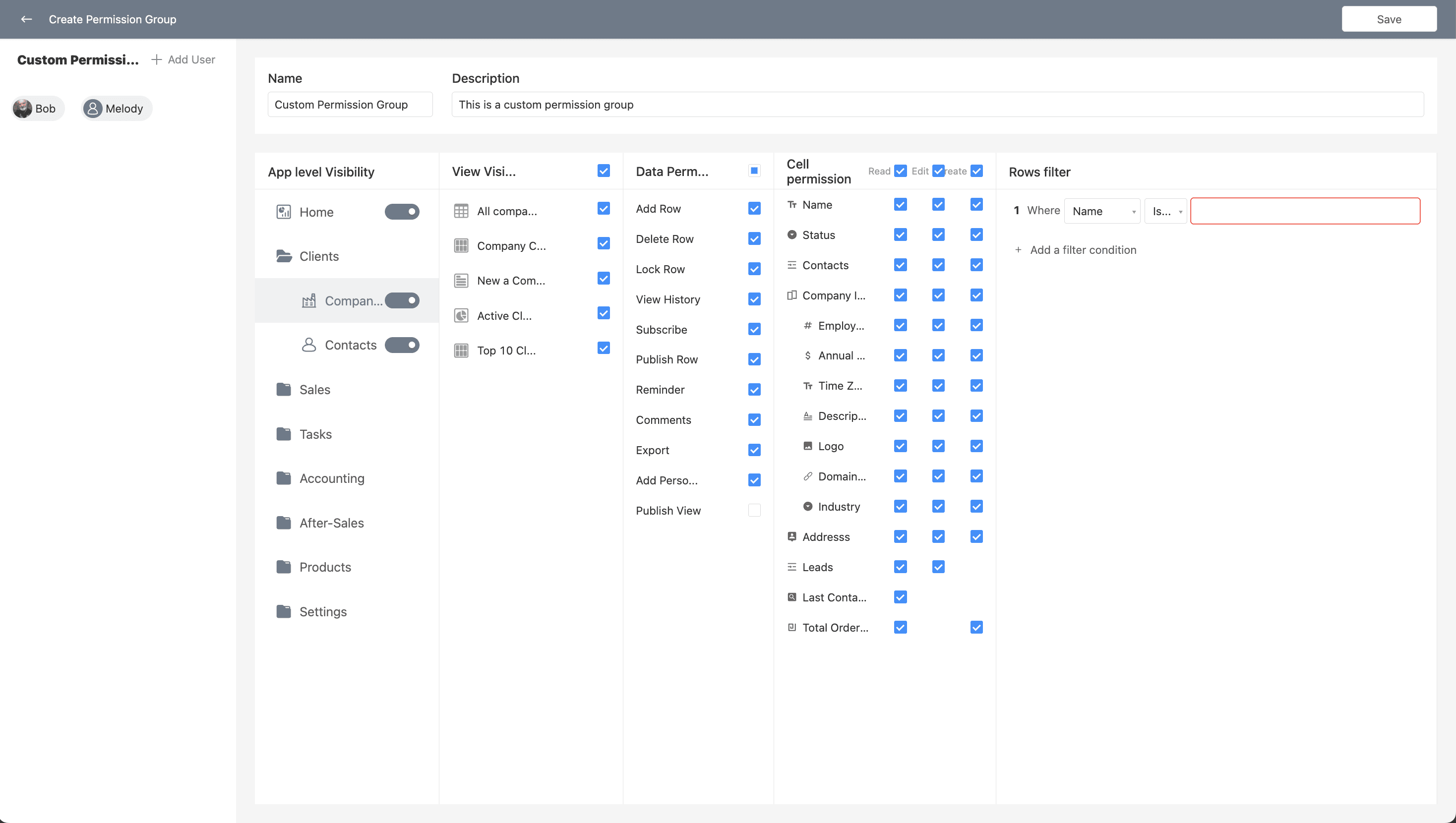 - Custom permissions at the app, view, data, and field levels